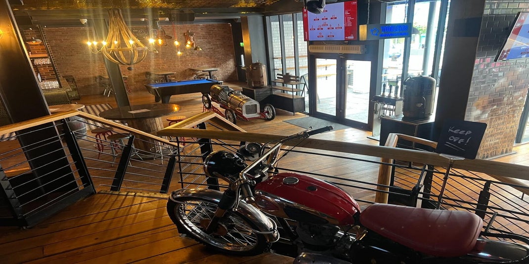 - Highly praised atmosphere with industrial-style décor, murals, and vintage motorcycles on display